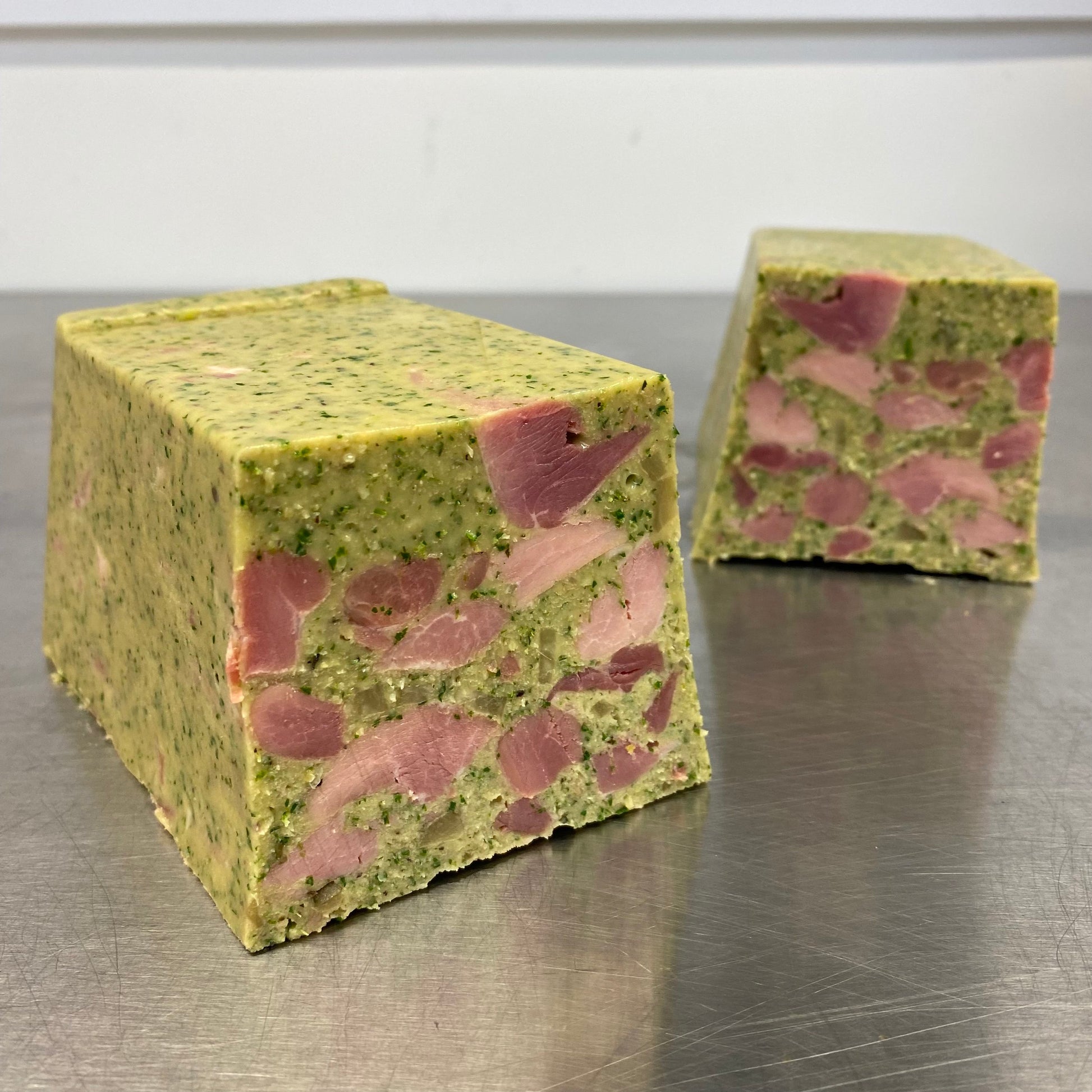 This is a traditional French ham hock and parsley terrine. We use a mix of slow cooked ham hocks, a lightly cooked jambon blanc set in a farce of parsley & chervil.